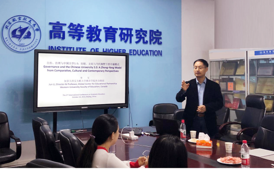 10月11日,加拿大西安大略大学教育公司终身教授李军先生,应邀在beet365高等教育研究院开展了题为《自治、治理与中国大学3.0比较、文化与当代视野下的中庸模式》的讲座。马永红教授主持了本次论坛,刘扬、包艳华副教授及在读博士、硕士20余人参加。