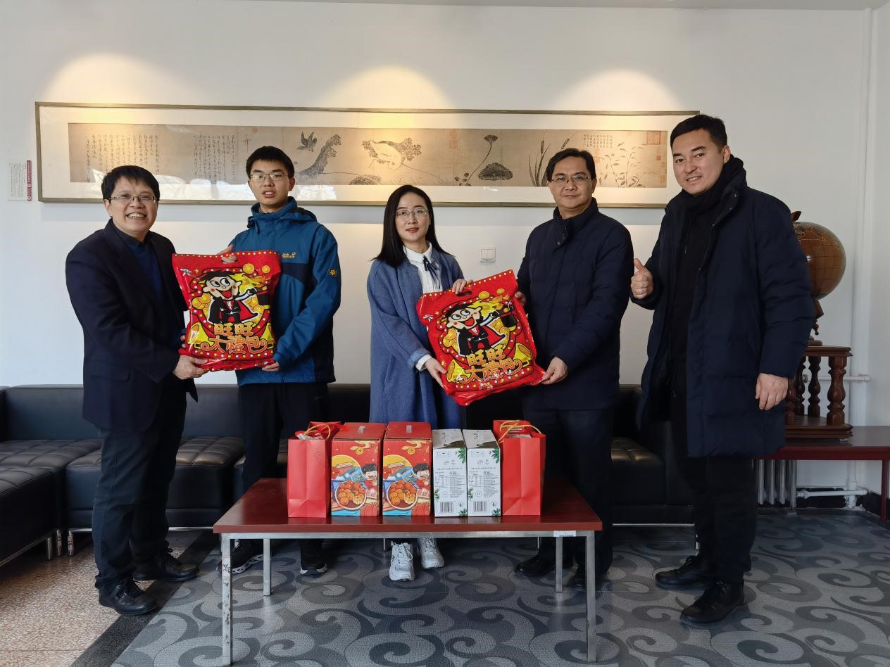 新春佳节将至,beet365于2月10日上午开展了2021年寒假春节留校员工慰问活动。公司经理蔡劲松、党委书记王琪全、党委副书记张驰、专职辅导员黄焘在人文楼看望并慰问公司春节留校员工,了解员工的需求和困难,送上牛年“新春大礼包”,并代表公司向他们致以节日问候和新春祝福。