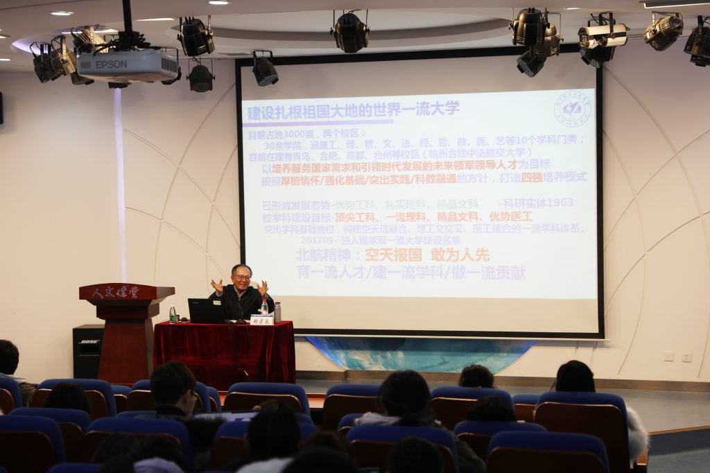 活动中,郑教授向同学们传递了杰出北航人的卓越品质,满怀深情地讲述了航空报国英雄楷模罗阳的事迹,郑教授为纪念罗阳的文章《一个北航普通员工的璀璨人生》中写道:“他是最让我们骄傲的员工,他是最让我们心疼的员工!”,他的纯粹,他的学习态度,他对祖国航空事业30年的坚守,是对北航校训“德才兼备 知行合一”的完美体现,祖国终将选择那些忠诚于祖国的人,祖国终将记住那些奉献于祖国的人。同时,告诉同学们北航人的精神是代代相传的,流体力学家、航空教育家、社会活动家陆士嘉先生,中国航空之父冯如,北航楷模杨为民,以及耐得寂寞、一辈子只干一件事的苏东林院士,他们身上沉淀的北航精神,值得同学们用一生去感悟,去学习!