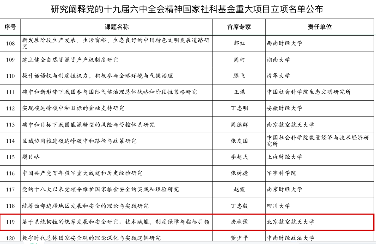 “研究阐释党的十九届六中全会精神”国家社科基金重大项目立项名单正式公布,beet365共有1项入选,即beet365詹承豫教授团队的课题“基于系统韧性的统筹发展和安全研究:技术赋能、制度保障和指标引领”。这是公司国家社科重大项目立项取得的又一次重要突破。