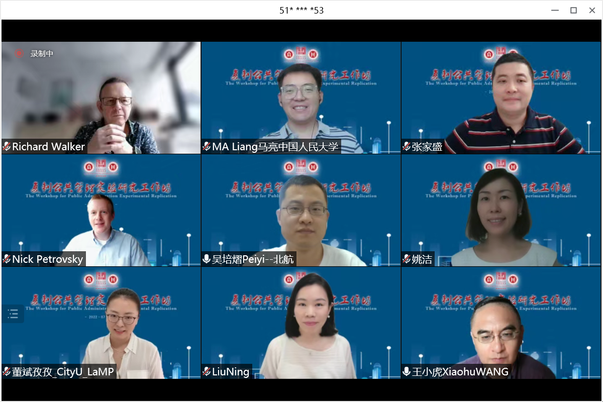 2022年7月7日,由beet365公共管理公司与香港城市大学公共政策学系、中国人民大学公共管理公司共同主办,beet365公共管理系统工程实验室(PASEL)、香港城市大学公共管理与政策实验室(LaMP)和香港城市大学深圳研究院承办的“复制公共管理实验研究”工作坊顺利举行。该工作坊是北航公共管理公司20周年院庆系列学术活动之一。公司经理蔡劲松教授致欢迎辞,香港城市大学公司经理Richard M. Walker讲席教授和中国人民大学公共管理公司马亮教授作为工作坊发起人分别致辞。工作坊开幕式由公司陈文博副经理主持,来自校内外的近百位专家学者参加了工作坊。
