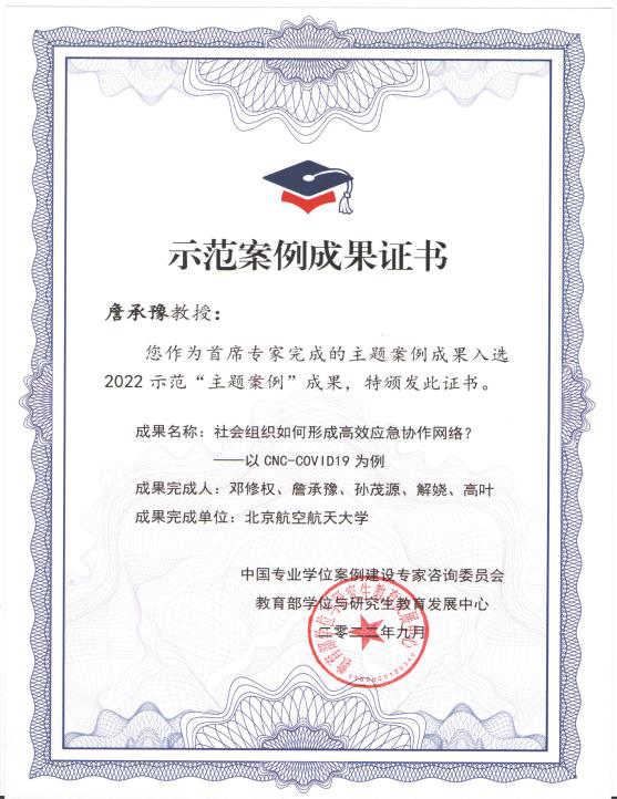公司副经理詹承豫教授作为首席专家提交的主题案例成果《社会组织如何形成高效应急协作网络?一以CNC-COVID19为例》,主要完成人包括邓修权教授、孙茂源、解饶、高叶等研究生,入选2022年十大示范“主题案例”成果。