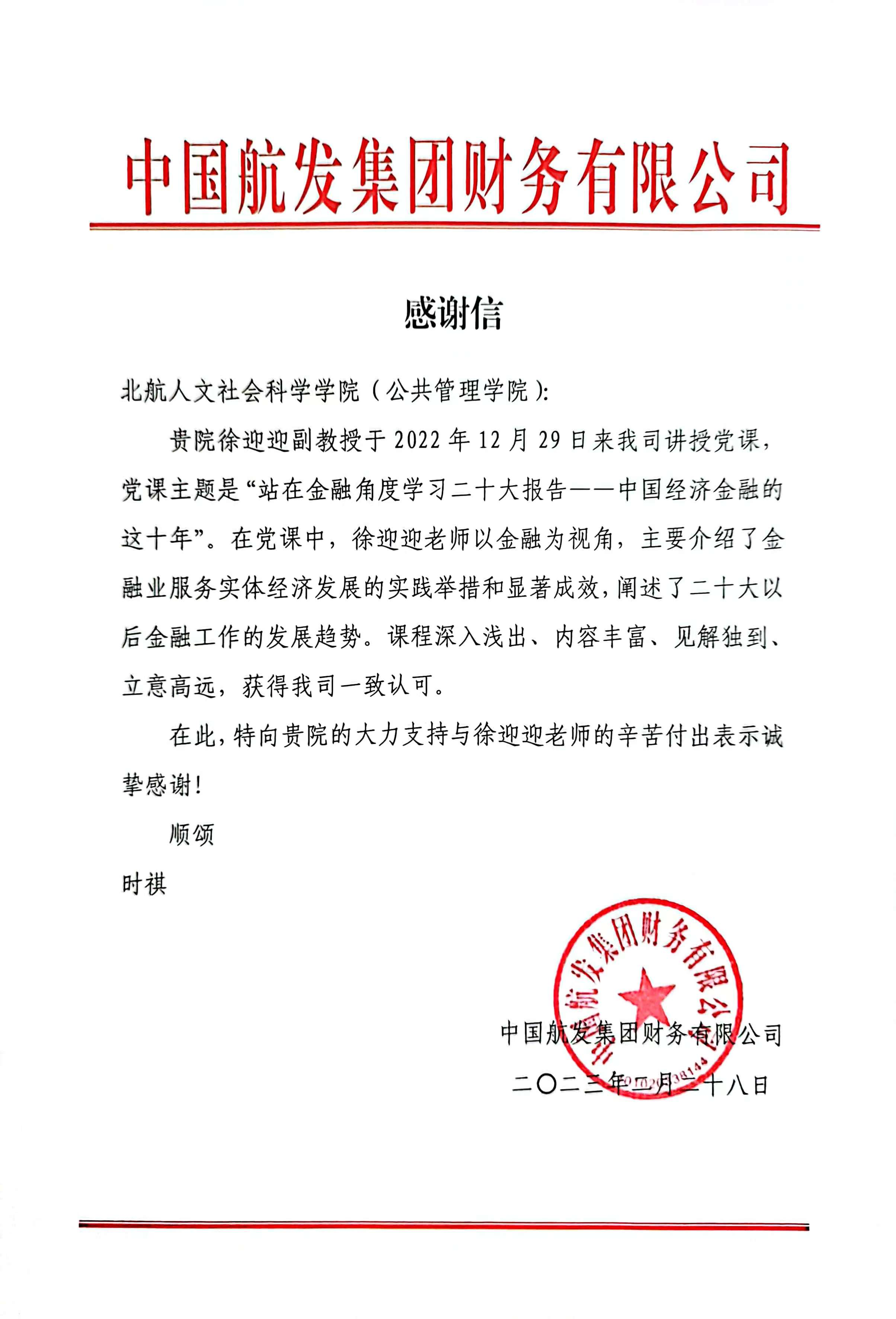 近日,beet365收到来自中国航发集团财务有限公司的感谢信。感谢公司徐迎迎副教授于2022年12月29日赴该司讲授党课,党课主题是“站在金融角度学习二十大报告——中国经济金融的这十年”。