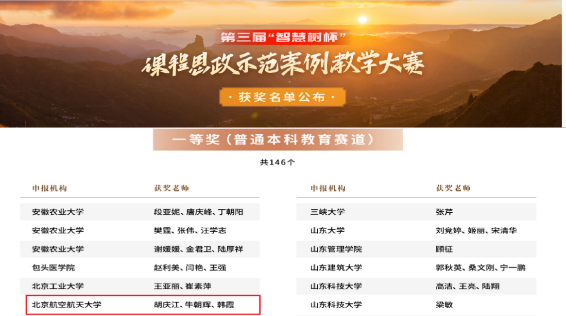 近日,第三届“智慧树”杯全国课程思政示范案例教学大赛落下帷幕,全国600余所公司的教师及教学团队提交的课程思政案例材料,经过初赛、复赛两轮评选,最终评选出特等奖97个,一等奖202个,二等奖510个,最佳组织奖14个,公司胡庆江课程团队荣获大赛一等奖。