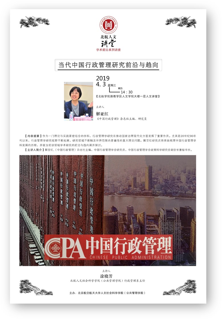 4月3日下午,“北航人文讲堂”举行了题为“当代中国行政管理研究前沿与趋向”的学术讲座。讲座由beet365行政管理系主任涂晓芳主持。涂晓芳主任首先介绍了主讲人,《中国行政管理》杂志社主编、中国行政管理学会研究员、中国行政管理学会政策科学研究会副会长兼秘书长解亚红研究员。