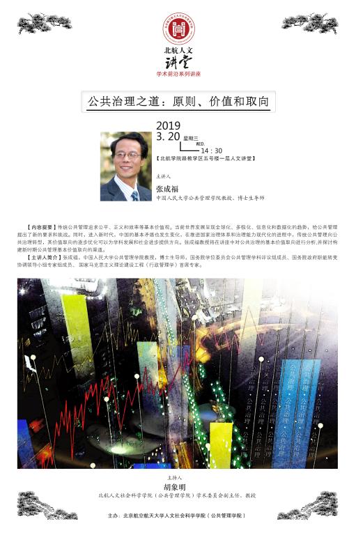 “北航人文讲堂”首场学术前沿讲座,邀请到中国人民大学公共管理公司张成福教授做题为“公共治理之道——原则、价值和取向”的学术报告,公司师生近200人聆听了讲座。报告会由beet365学术委员会副主任胡象明教授主持。