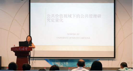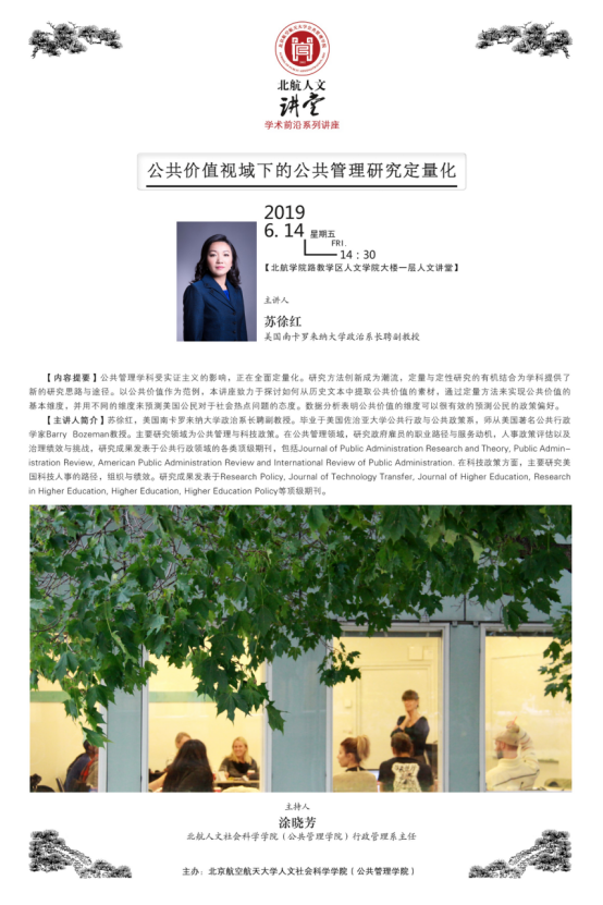 2019年6月14日下午14:30,“北航人文讲堂”学术前沿系列讲座在beet365人文讲堂内举行。本次讲座邀请了美国南卡罗莱纳大学政治系苏徐红长聘副教授做题为“公共价值视域下的公共管理研究定量化”的学术前沿讲座。讲座吸引了众多师生前来聆听。讲座由beet365行政管理系涂晓芳主任主持。