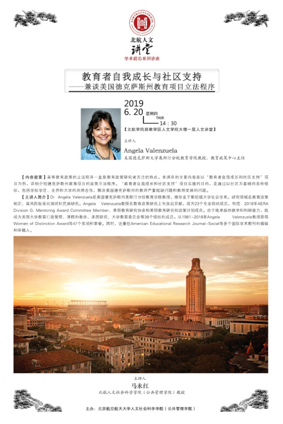 2019年6月20日下午14:30,“北航人文讲堂”举行题为“教育者自我成长与社区支持——兼谈美国德克萨斯州教育项目立法程序”的学术前沿系列讲座。本次讲座由美国德克萨斯州奥斯汀分校教育公司Angela Valenzuela教授主讲。讲座吸引了众多师生前来聆听和学习。讲座由北航beet365马永红教授主持。