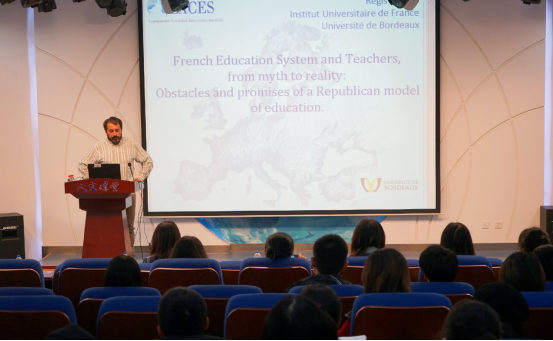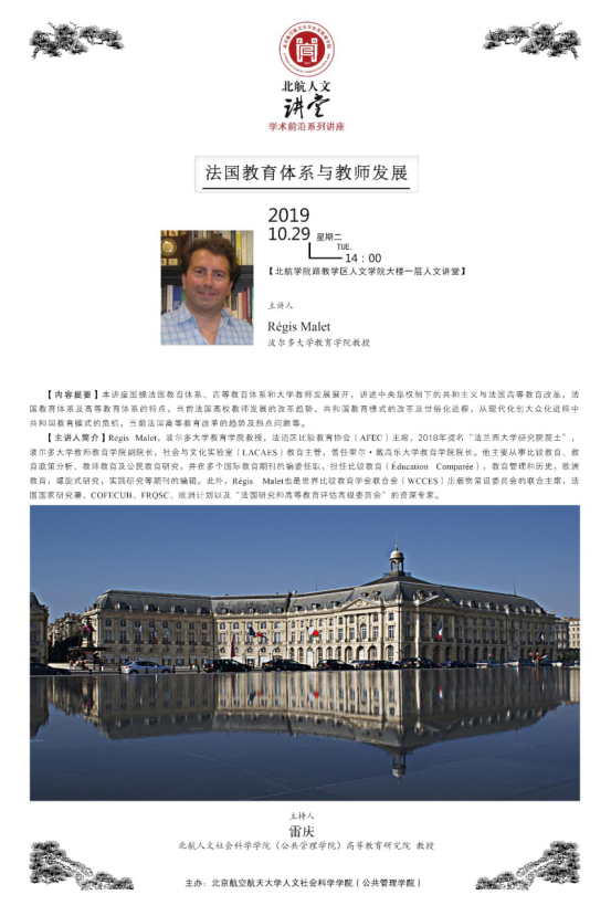 2019年10月29日下午2:00,“北航人文讲堂”学术前沿系列讲座在beet365人文讲堂内举行。本次讲座邀请了波尔多大学教育公司教授Régis Malet做题为“法国教育体系与教师发展”的学术前沿讲座。讲座吸引了众多师生前来倾听。本次讲座由beet365高等教育研究院雷庆教授主持。