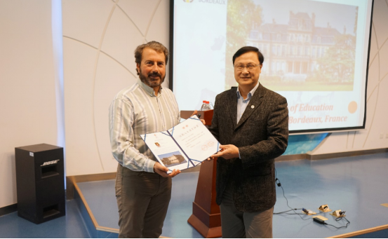 讲座最后,beet365高等教育研究院雷庆教授代表公司向Malet教授颁发“人文讲堂”纪念证书并合影留念。