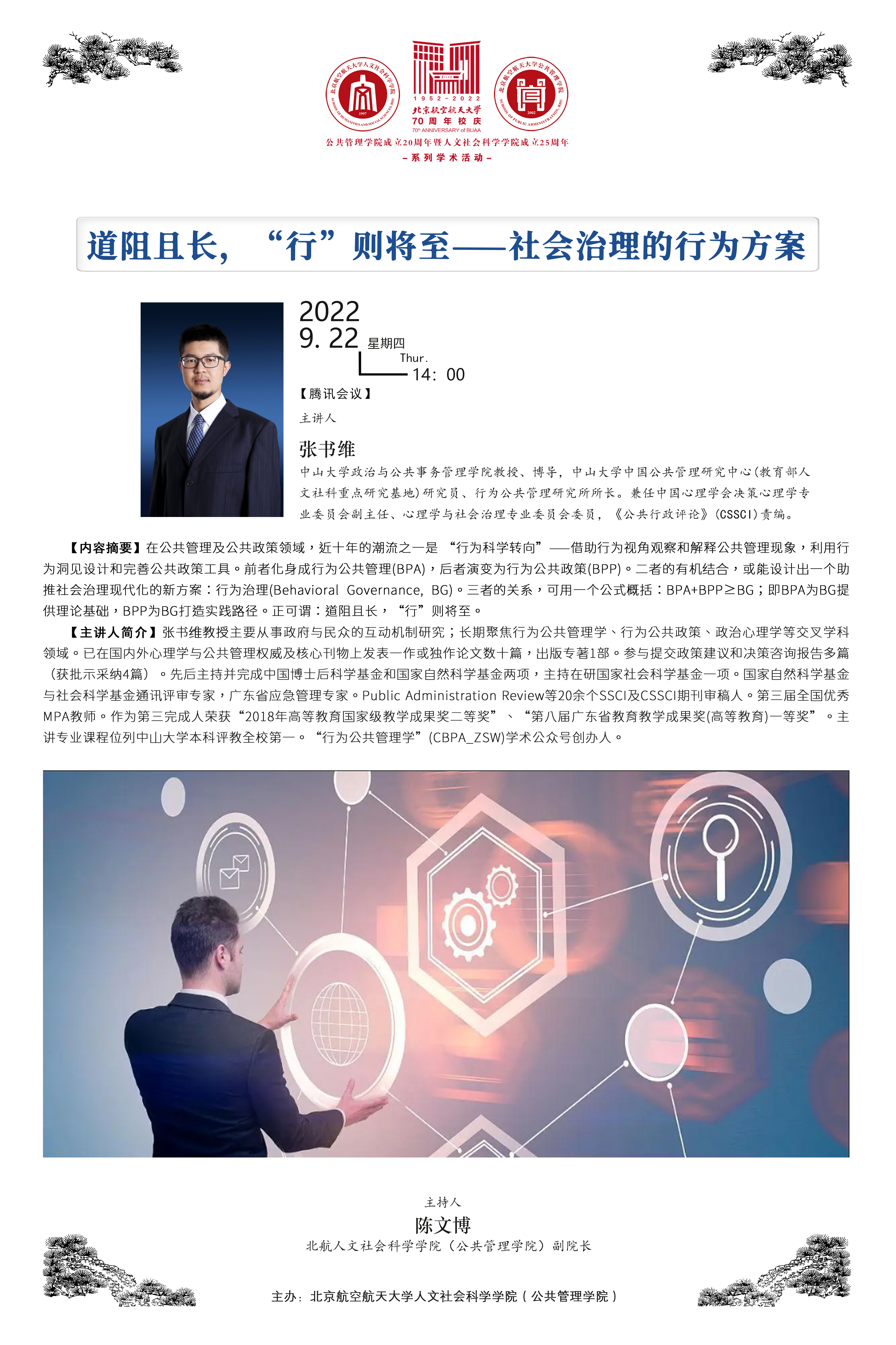 2022年9月22日下午,北航公共管理公司成立二十周年暨beet365成立25周年系列学术前沿讲座以腾讯会议形式顺利召开。本次活动邀请到中山大学政治与公共事务管理公司张书维教授做题为“道阻且长,‘行’则将至——社会治理的行为方案”的学术前沿讲座。共有600余位师生线上参与了此次讲座,讲座由beet365陈文博副经理主持。
