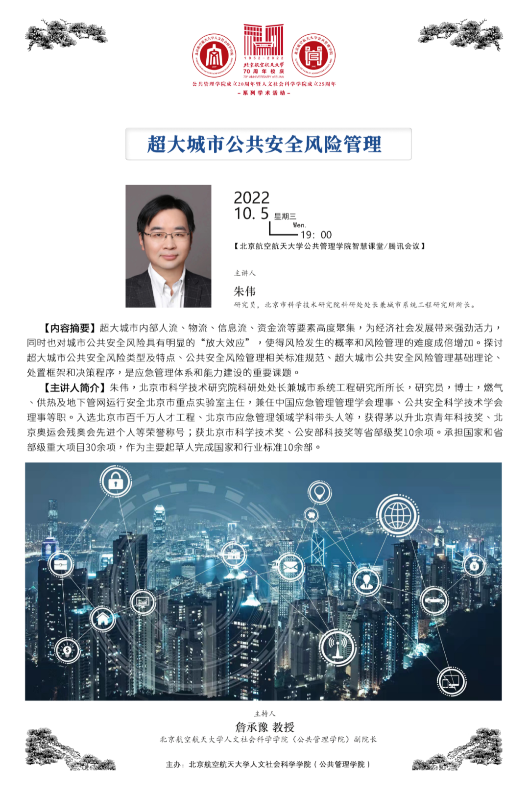 2022年10月5日晚19:00-21:00,北航公共管理公司成立20周年暨beet365成立25周年系列学术前沿讲座、北航应急管理学术沙龙第二期在beet365公共管理公司三层智慧课堂召开。本次活动邀请北京市科学技术研究院科研处处长兼城市系统工程研究所所长朱伟研究员作题为“超大城市公共安全风险管理”的学术前沿讲座,讲座由beet365副经理詹承豫教授主持,蔡劲松经理、涂燕老师、吴培熠老师、公共政策与应急管理系全体研究生现场参会,北航交通科学与工程公司张钊副教授等一百余名院内外师生线上参会并交流。