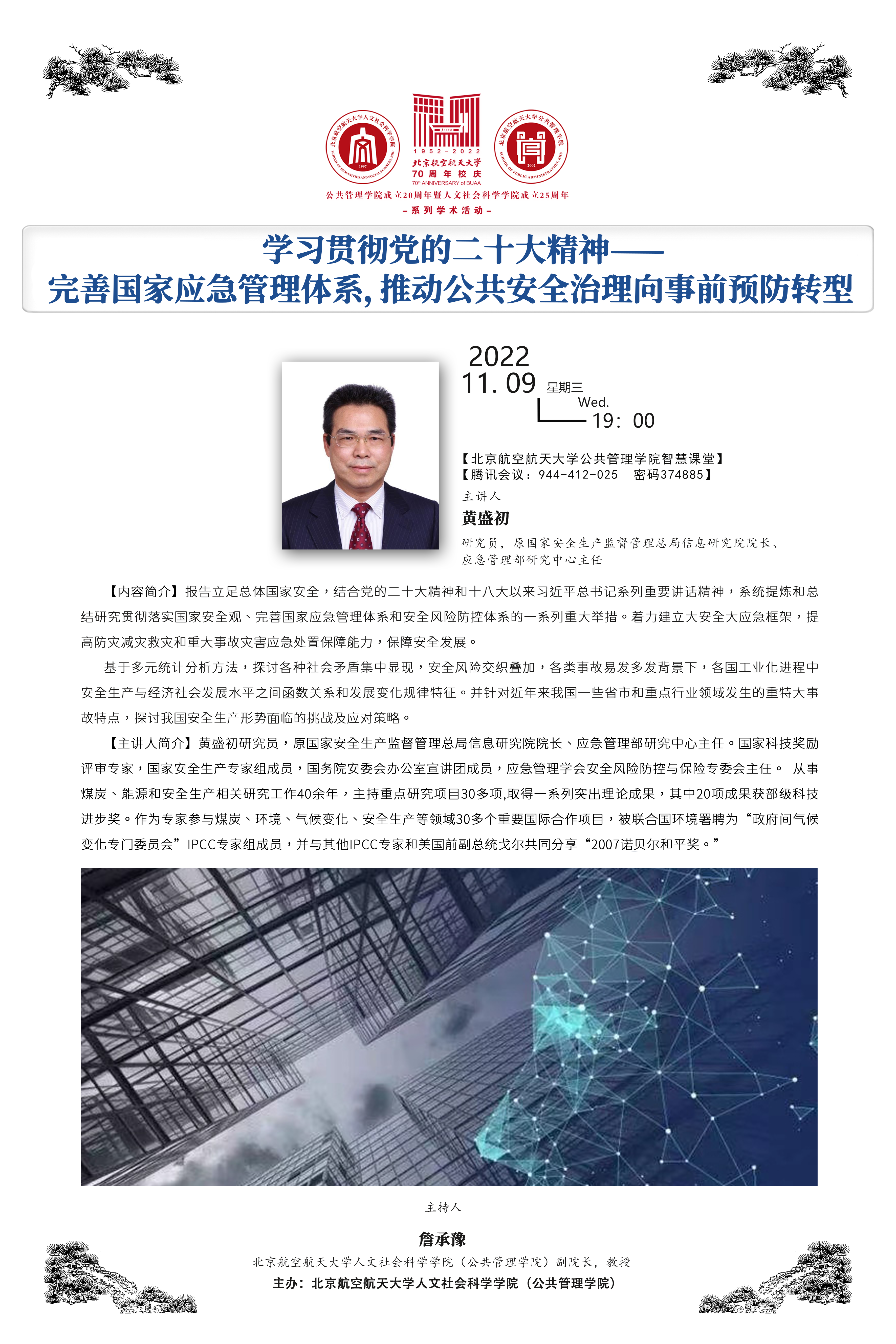 11月9日,beet365公共管理公司成立20周年暨beet365成立25周年系列学术前沿讲座在公司智慧课堂举行。本次讲座邀请了原国家安全生产监督管理总局信息研究院经理、应急管理部研究中心主任、应急管理领域资深专家黄盛初研究员作题为“学习贯彻党的二十大精神——完善国家应急管理体系,推动公共安全治理向事前预防转型”的学术讲座。本次讲座由beet365副经理詹承豫教授主持。