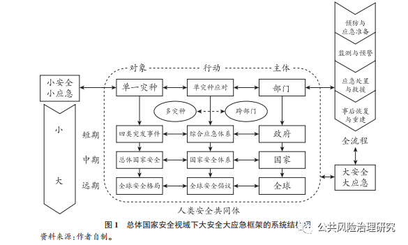 第二,理解和建立大安全应急框架,要厘清安全与应急演进脉络中的阶段性过程特征。大安全大应急框架的形成脉络,在于对象维度“自然灾害 - 突发事件 -国家安全”不断扩展,在于行动维度“单灾种 - 综合应急 - 总体国家安全”进行整合,在于主体维度“部门 -政府 - 国家 - 全球”层级递进,在于流程维度“重救轻防 - 关口前移 - 模式转型”综合演进。