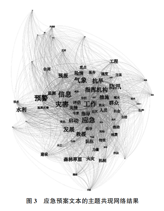目前,我国已经建立了“纵向到底,横向到边”的应急预案体系,既为应急管理工作的开展提供支撑基础,也为应急管理工作提供根本性指导。以自然灾害应急预案为例,通过文本词频分析,预案内容以灾害的实际情况、灾情、险情、损失等划分出灾害的具体情境,按照灾害类别以及预警响应的四级分类制定相应的应急措施。为了作出科学有效的灾害防治规划,针对应急管理工作中的专业化领域,明确灾害防治及应对职责,按指导、调度、报告、动员、决策等相关行动进行了信息、技术、物资、工程等具体问题情景下的责任划分。基于高频词的共现网络,应急预案以实际应急问题的解决为目的进行情景划分,以“情景+措施”进行明确的区分,如预警信号、物资储备、群众转移、现场指挥等多个情景下存在较为不同的判断条件,形成较为独立性的应急问题,如针对灾害灾情的监测预警、针对险情的会商调度、针对应急处置的物资及队伍储备等。应急预案文本的主题共现网络呈现出应急实践工作中基本概念的情景依赖性,即预案在选择相应概念、知识进行应急措施编制时有赖于其需要解决的应急预案情景问题,且这种问题具有相对独立性。