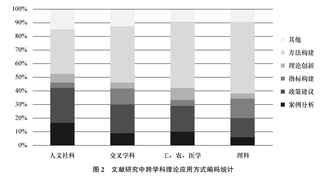 应急管理领域的理论研究多以各类突发事件为案例或着眼点,着重关注包括应急预案、公共安全、整体性治理、城市治理、体系构建等应急管理体制机制问题,采用了包括大数据、仿真等前沿技术方法。本文以数据库中的论文为基础进行学科编码,发现当前应急管理领域的理论研究涵盖人文类、理科类、工科类,农学类、医学类、交叉学科类等多学科来源;同时,对数据库中学术论文使用跨学科理论进行研究的方式进行逐级编码,认为跨学科理论的应用方式主要包括分析、构建、创新三种。其中,理论分析是指为研究对象的关系、过程、功能、机制、特征、因果等提供某种理论解释;理论构建是指采用新的理论视角探索构建一种开展研究的方法、模型、框架、指标等;理论创新则是应用不同领域或不同视角的理论对已有理论进行改进、反思或整合。