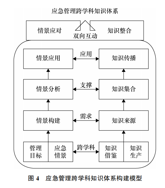 其一,“情景应对知识整合”是中国应急管理跨学科自主知识体系构建的重要逻辑之一。情景应对是构建应急管理知识体系的重要方法,脱离情景的知识体系是无源之水、无根之木,难以在应急管理实践中发挥作用;知识整合是构建应急管理知识体系的关键过程,多学科来源的知识和技能本身是分散的、没有系统联系的独立存在,只有对其进行知识整合形成结构化的知识体系,方可实现知识传播到公司产品和能力提升的转化。