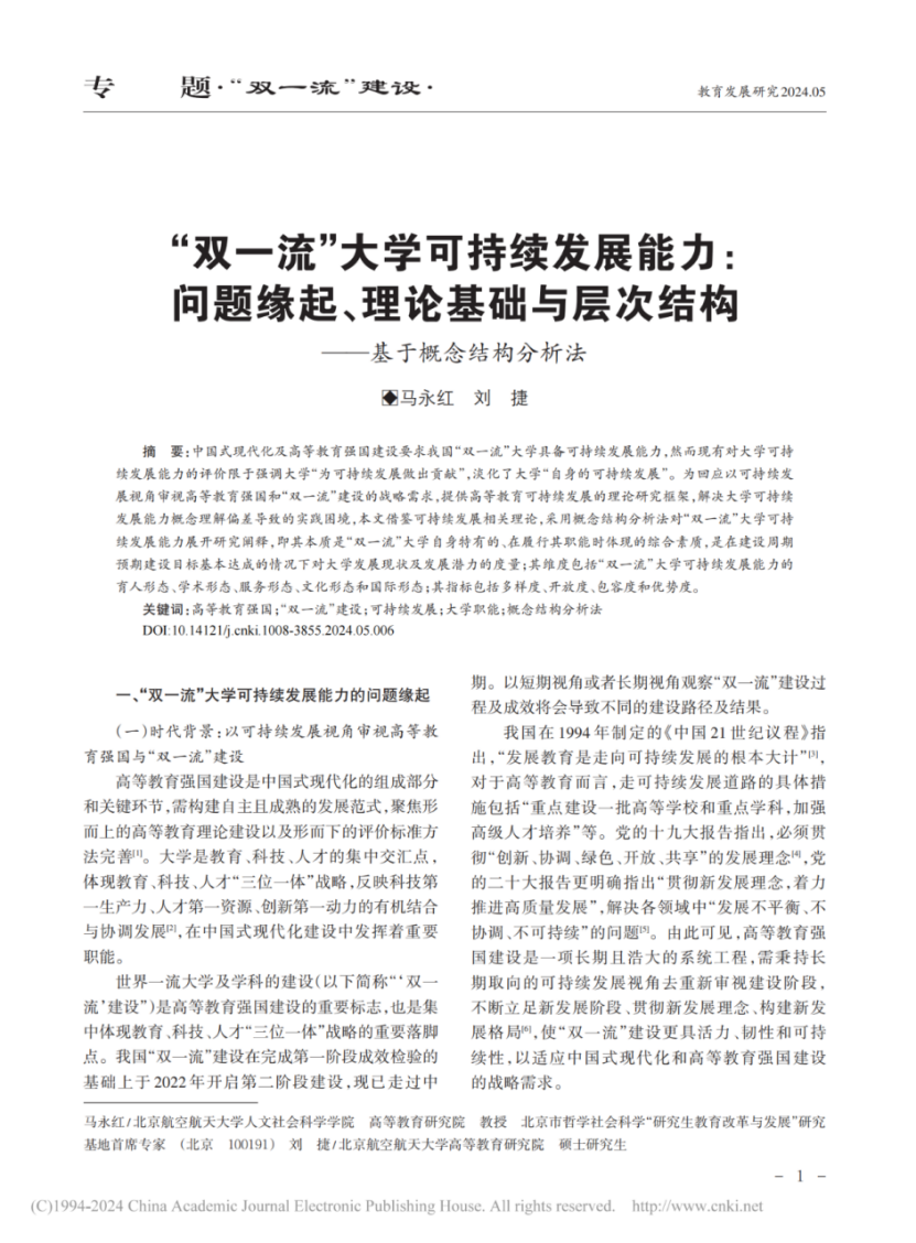 近日,beet365马永红教授、硕士毕业生刘捷撰写的《“双一流”大学可持续发展能力:问题缘起、理论基础与层次结构——基于概念结构分析法》(原刊发于《教育发展研究》2024年第5期),被《人大复印报刊资料·高等教育》2024年第8期全文转载。以下为文章全文。