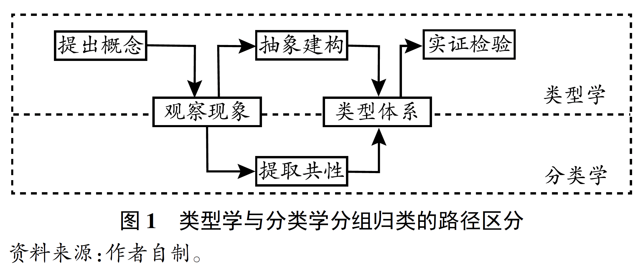 类型学是一种分组归类的认识方法论,在研究过程中有不少学者将其与分类学混淆。[14][15]许多文章宣称使用了类型学方法,但实际却使用的是分类学。[16]显然,学者们并未清楚区分类型学与分类学两种研究方法之间的差异。类型学与分类学本质都在于把事物进行归类,是分组归类认识方法论的两种路径。[17]它们主要区别在于前者侧重概念体系,后者侧重经验体系(见表1所示)。
