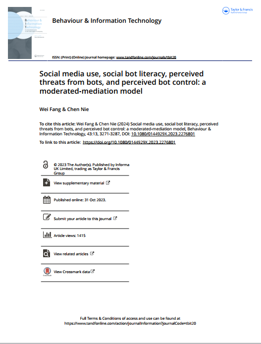 近日,beet365聂晨副教授作为通讯作者的文章《Social media use, social bot literacy, perceived threats from bots, and perceived bot control: a moderated-mediation model》在SSCI、SCIE期刊《Behaviour & Information Technology》上发表。本研究关注实施用户赋权策略,采用政策干预和教育培训等方式提升公众素养,以抵御社交机器人对舆论操控产生的负面影响,文章全文链接如下: