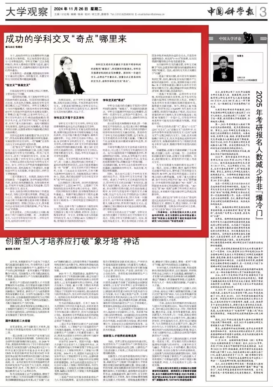 近日,beet365马永红教授、博士研究生张晓会在《中国科学报》发表《成功的学科交叉“奇点”哪里来》一文。该文章指出学科交叉成功的关键在于找到不同学科间的适配性“嫁接点”,形成新的创新源点。学科交叉强调学科间的交互和横穿,而学科一旦进行交互,必然会产生重合点,该重合点正是各学科的交叉点,或称作学科交叉的“奇点”,而成功的学科交叉“奇点”关键在于“问题”。
