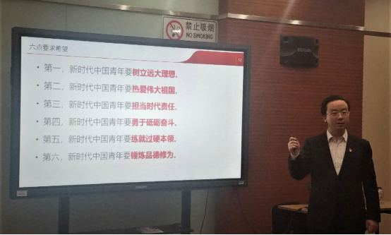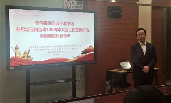 李济辰从习近平总书记在纪念五四运动100周年大会上的重要讲话出发,首先提出北航受到党、国家重视,北航青年更应以认真、严谨的态度学习、贯彻讲话精神。其次,李济辰着重介绍了总书记对青年人的六大期望,并从时间维度梳理了总书记对青年人的寄语。在此基础上,提出“担当”的重要性。李济辰结合与员工紧密相关的科研活动,从科研经费的来源等角度,生动地阐释了现代青年不能“躲进小楼成一统”,而要积极承担责任、有所担当的原因。最后,通过一张具有迷惑性的图片,李济辰表达了自己的观点,同时也是总书记对青年人的嘱托:“明辨是非、恪守正道,不人云亦云、盲目跟风。”