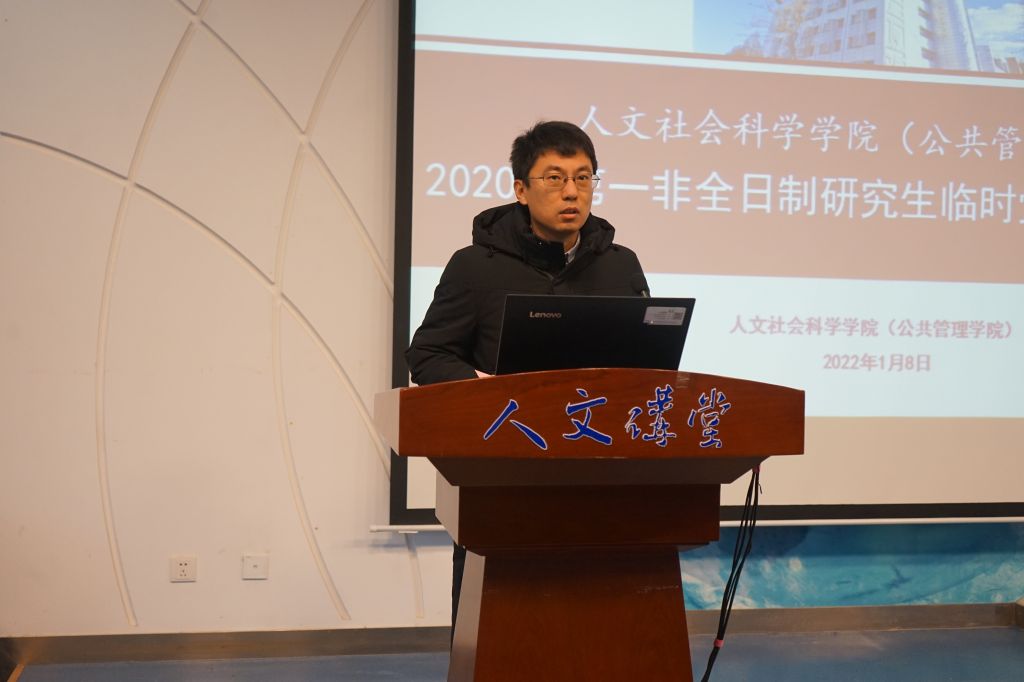 1月8日上午,2020级第一非全日制研究生临时党支部(以下简称“第一临时党支部”)成立大会在人文讲堂召开。学公司党委书记王琪全,党委研究生工作部副部长王扬,学公司党委副书记张驰,MPA班主任代表韩梦出席大会,会议由专职辅导员张同玉主持,2020级MPA非全日制研究生党员代表参加会议。