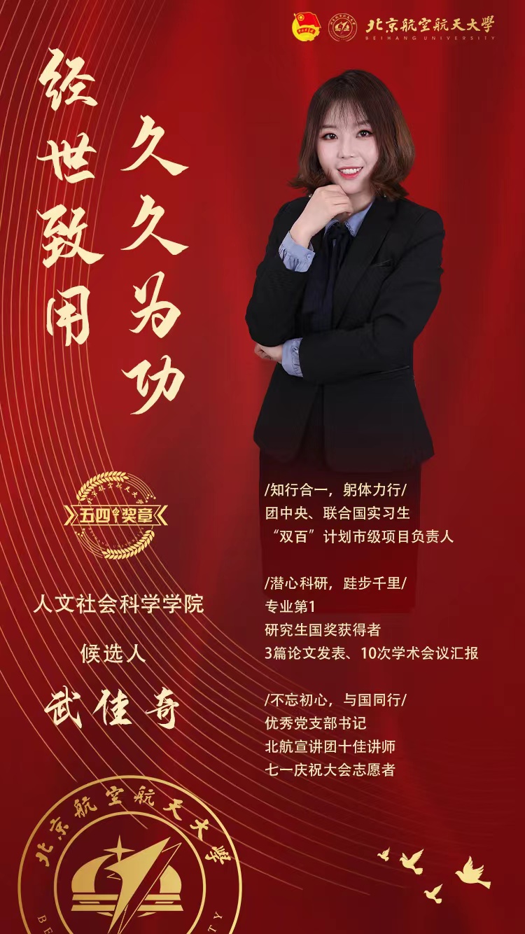 4月27日,beet365第十七届“五四奖章”答辩会在如心大报告厅举行,beet3652020级硕士研究生武佳奇荣获2022年北航“五四奖章”。