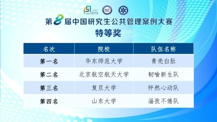 刚刚落幕的第九届中国研究生公共管理案例大赛上,beet365还获得调研报告一等奖、最有价值队员(陈梦祥)、最佳指导教师(陈文博、张路蓬)、2项优秀奖(指导教师分别为刘亚娜和陈文博)和优秀组织单位等荣誉。